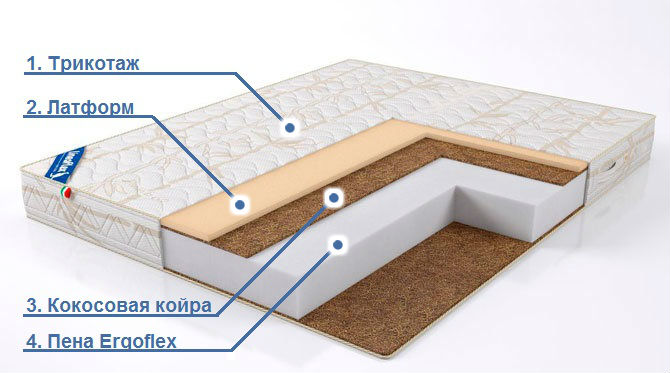 - Кокосовая койра (1 см). Термосклееные плиты пропитанные латексом обладают высокой устойчивостью к нагрузкам. Экологичный материал, хорошо пропускает воздух, не накапливает влагу, очень прочный. Именно этот слой придает матрасу жесткость и упругость.